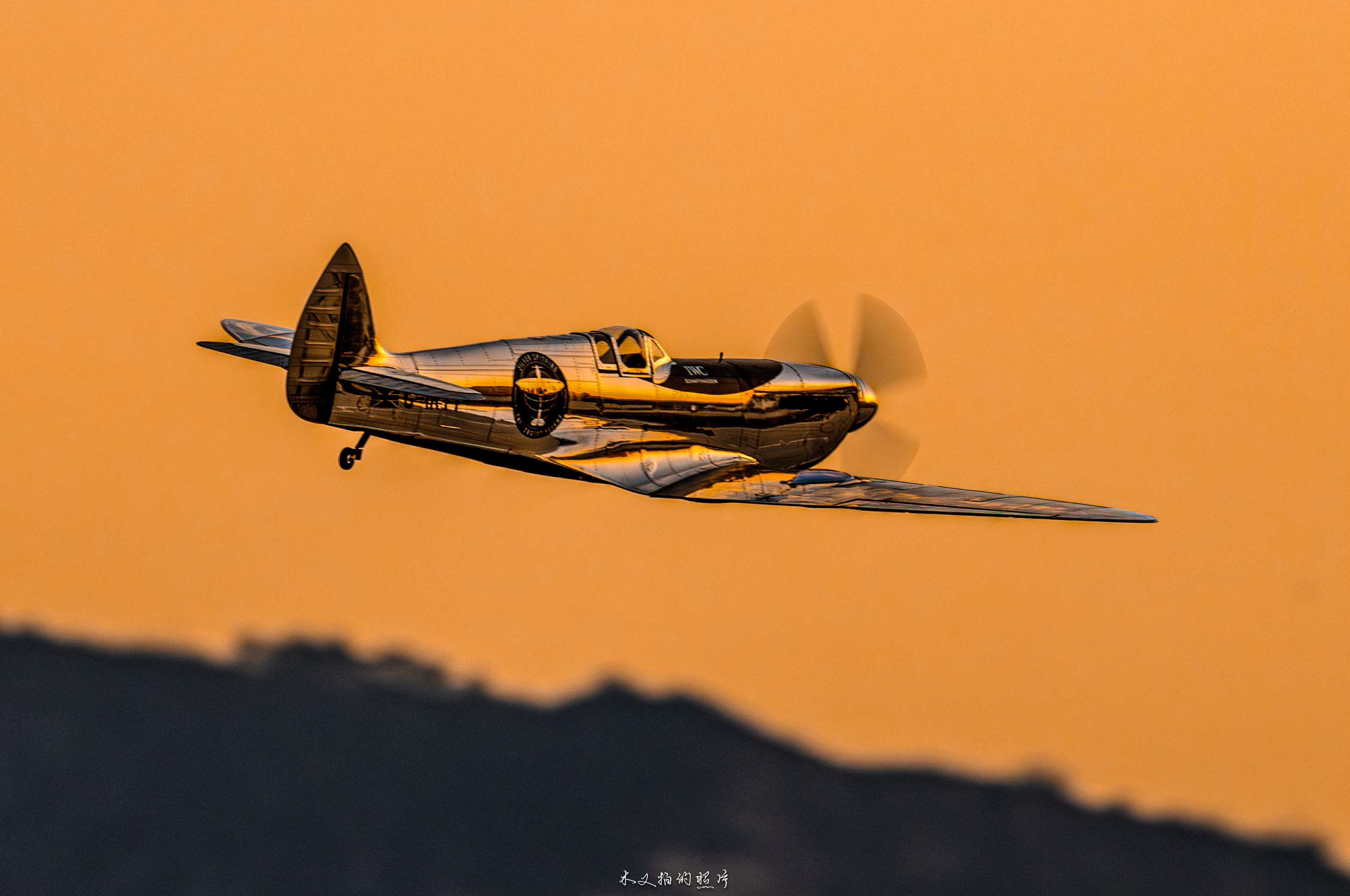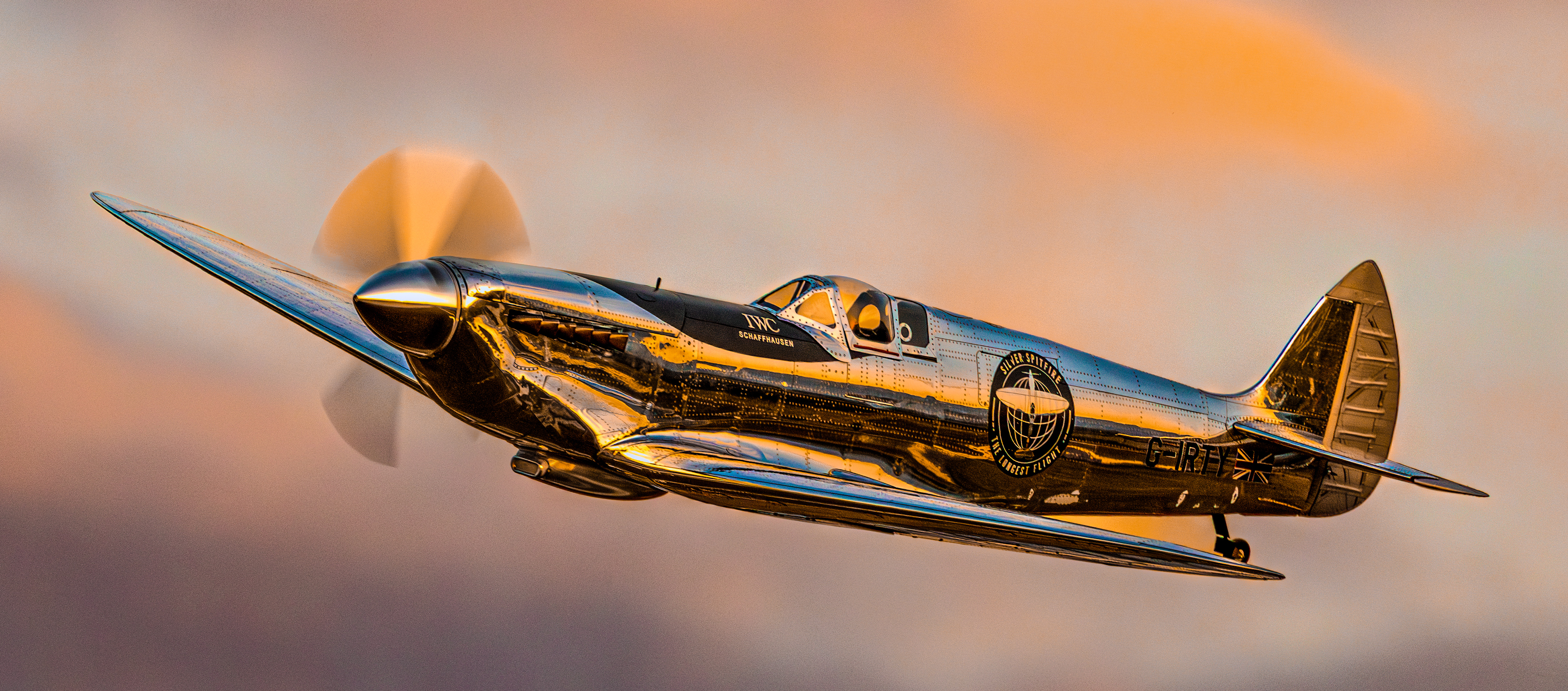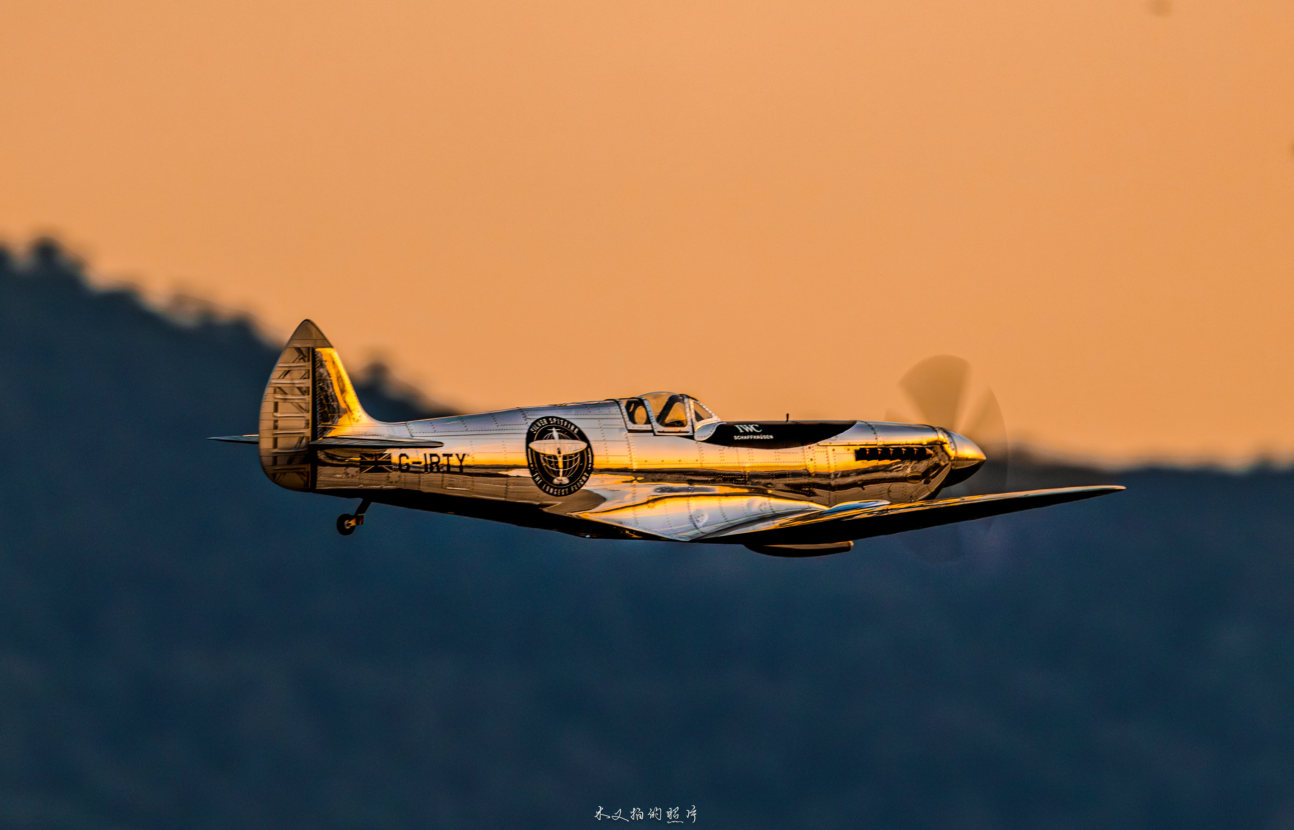 From the details, this Spitfire is not a military original, but a deeply modified civilian display aircraft: its most eye-catching feature is the chrome plated coating on the entire body, and the metal surface reflects the warm orange and light pink sky of dusk, combining the toughness of industrial machinery with the softness of light and shadow art, breaking the traditional painting paradigm of military fighter jets; The logo of "IWC SCHAFFHAUSEN" can be clearly seen on the side of the fuselage, confirming its cross-border cooperation with high-end watchmaking brands - the development of aviation chronometers is deeply bound to the aviation history of World War II. The pilot series watches of IWC originated from the history of creating professional timing tools for military pilots, and this Spitfire has become a symbol of the integration of aviation and watchmaking precision industries.