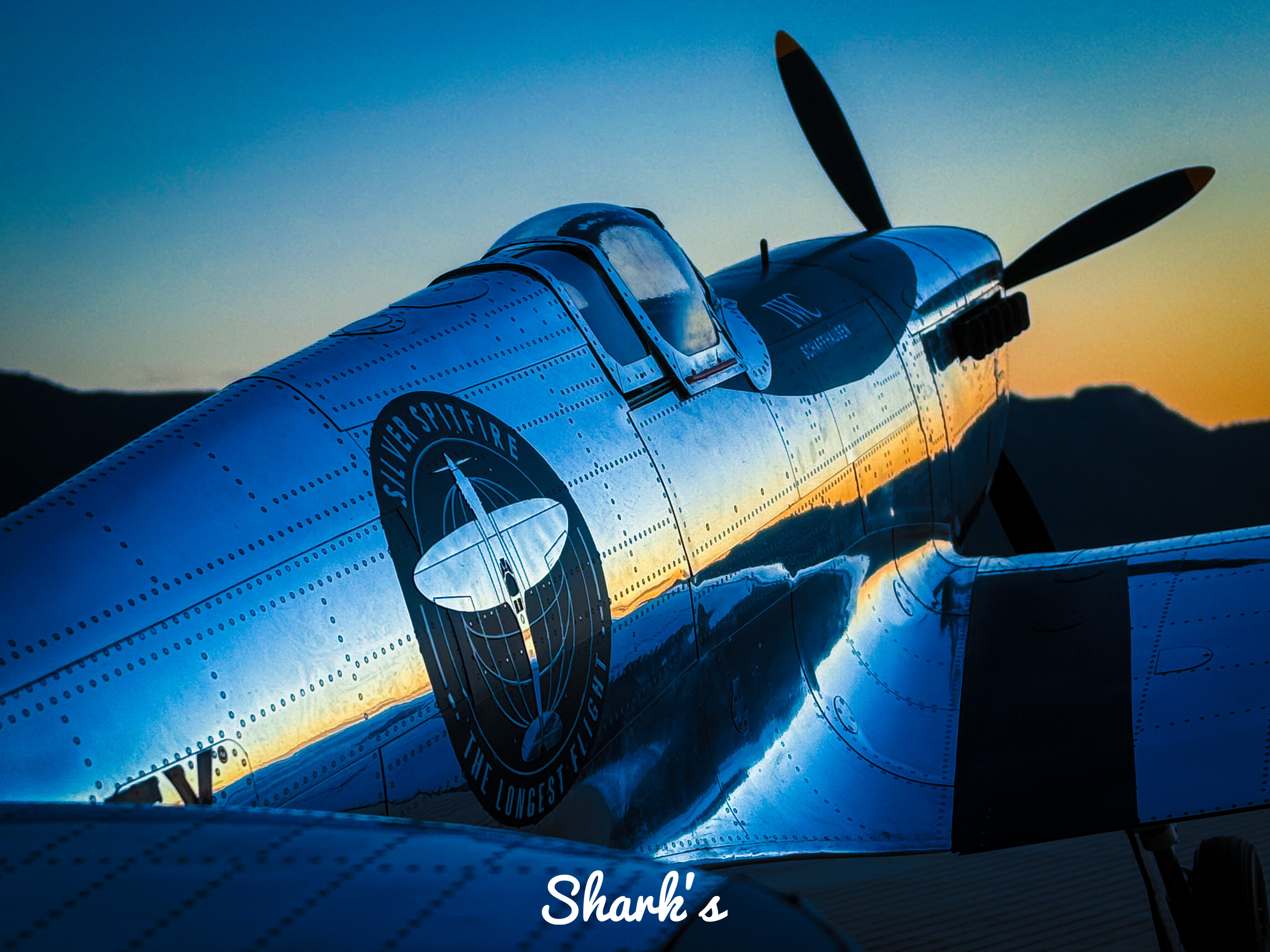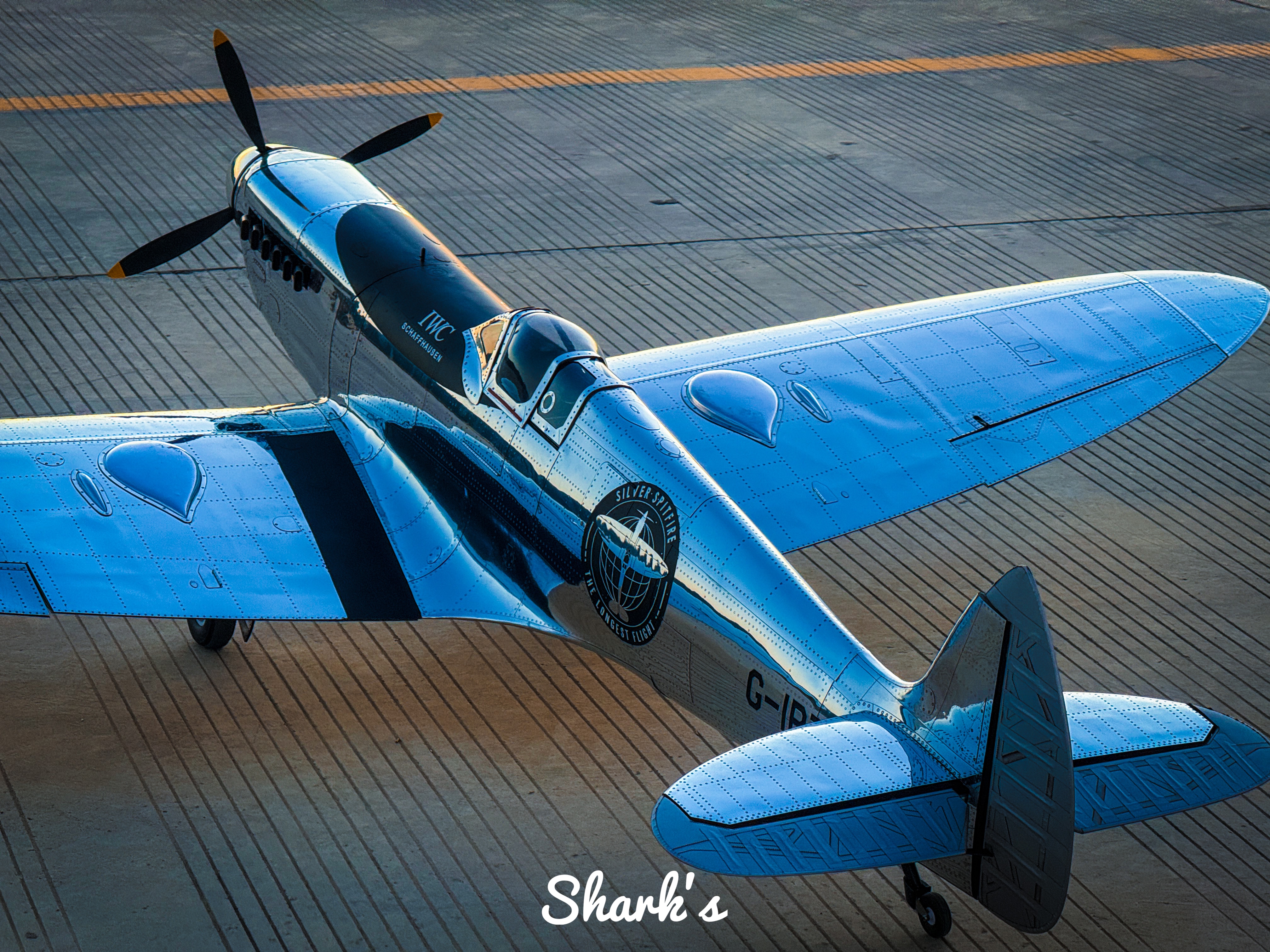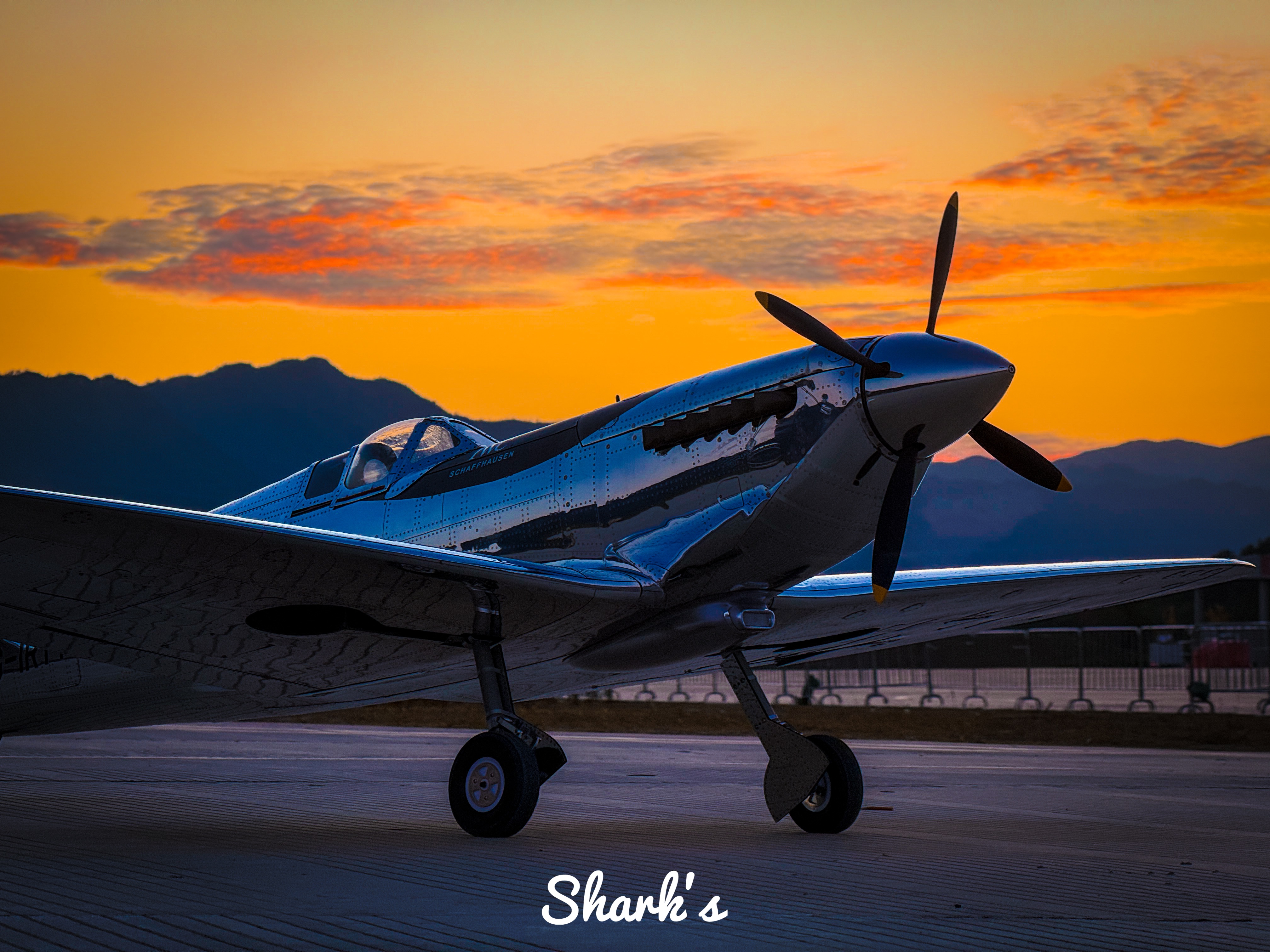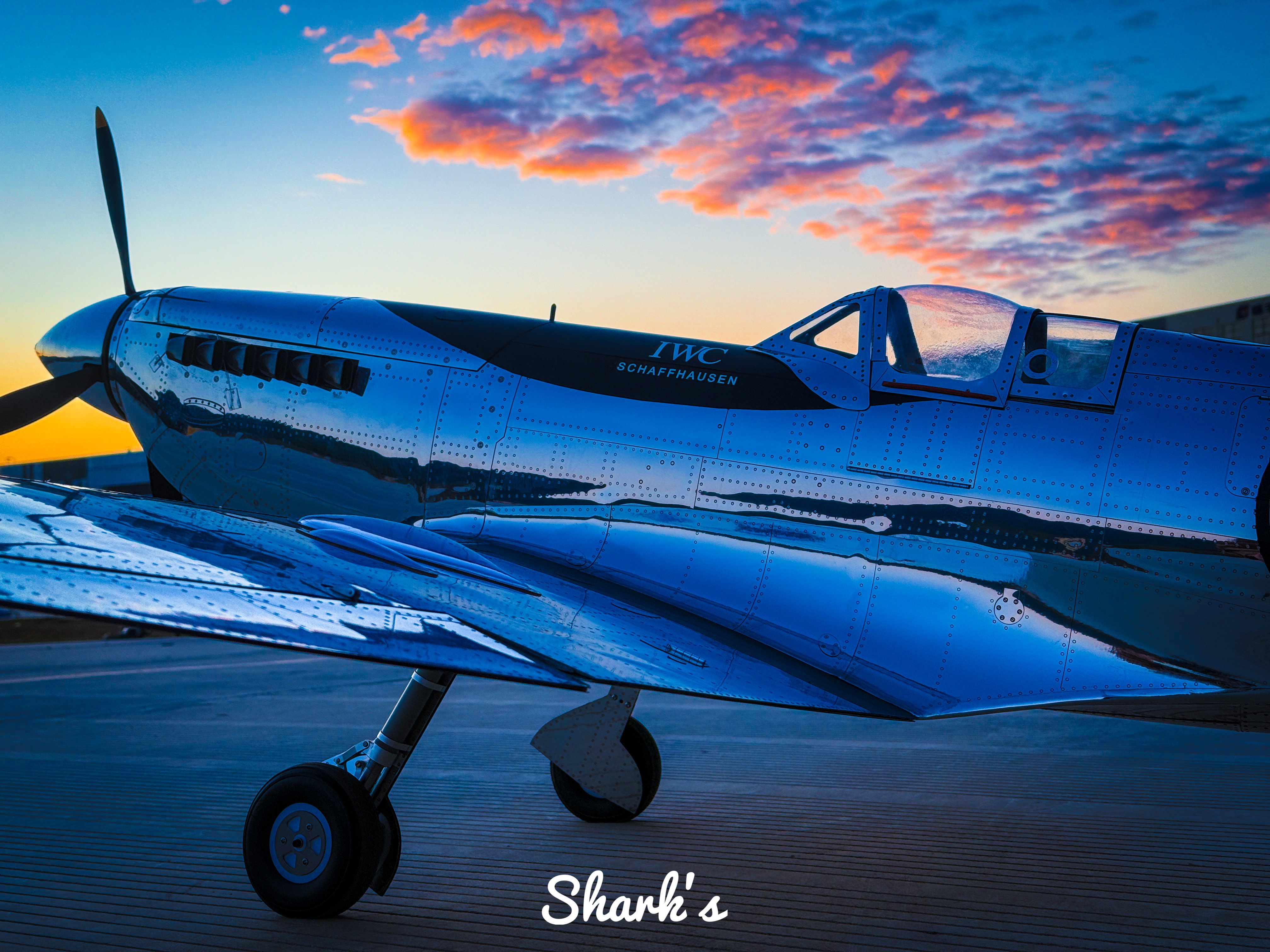 From the details, this Spitfire is not a military original, but a deeply modified civilian display aircraft: its most eye-catching feature is the chrome plated coating on the entire body, and the metal surface reflects the warm orange and light pink sky of dusk, combining the toughness of industrial machinery with the softness of light and shadow art, breaking the traditional painting paradigm of military fighter jets; The logo of "IWC SCHAFFHAUSEN" can be clearly seen on the side of the fuselage, confirming its cross-border cooperation with high-end watchmaking brands - the development of aviation chronometers is deeply bound to the aviation history of World War II. The pilot series watches of IWC originated from the history of creating professional timing tools for military pilots, and this Spitfire has become a symbol of the integration of aviation and watchmaking precision industries.